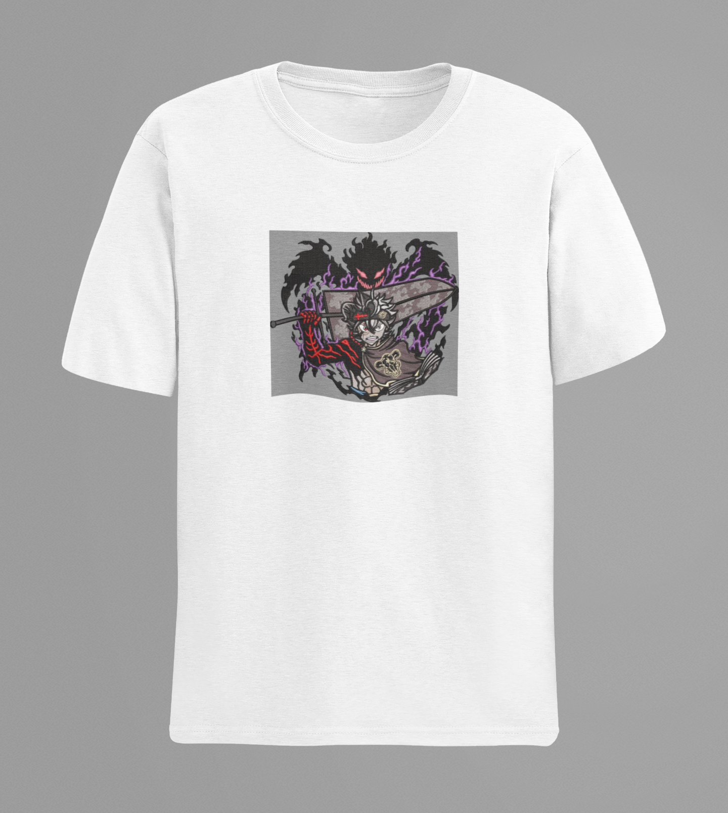 Premium Asta Demon embroidered t-shirt featuring detailed Black Clover anime artwork for bold streetwear style.