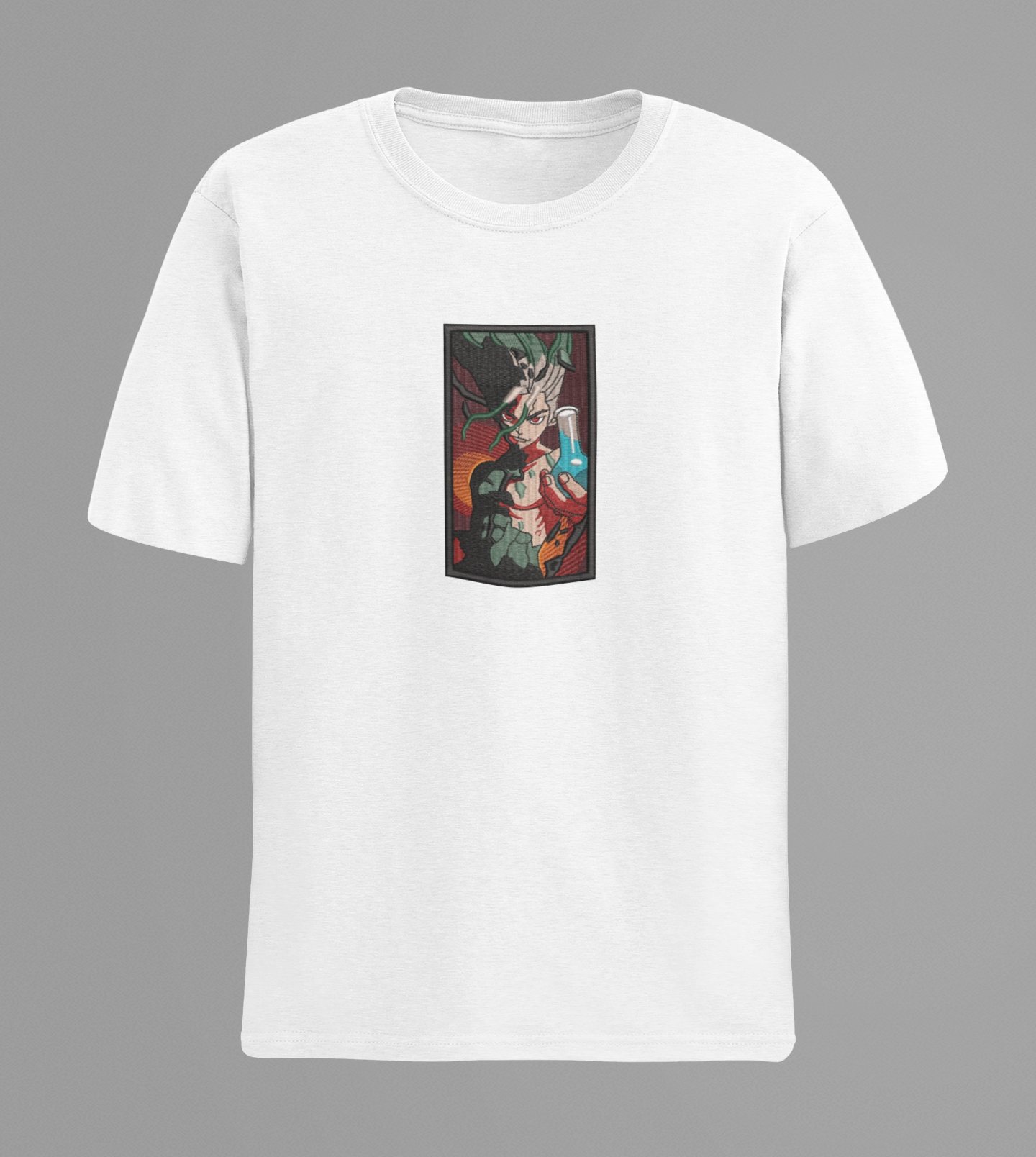 Dr. STONE embroidered anime T-shirt made with premium cotton for stylish, comfortable and durable streetwear.
