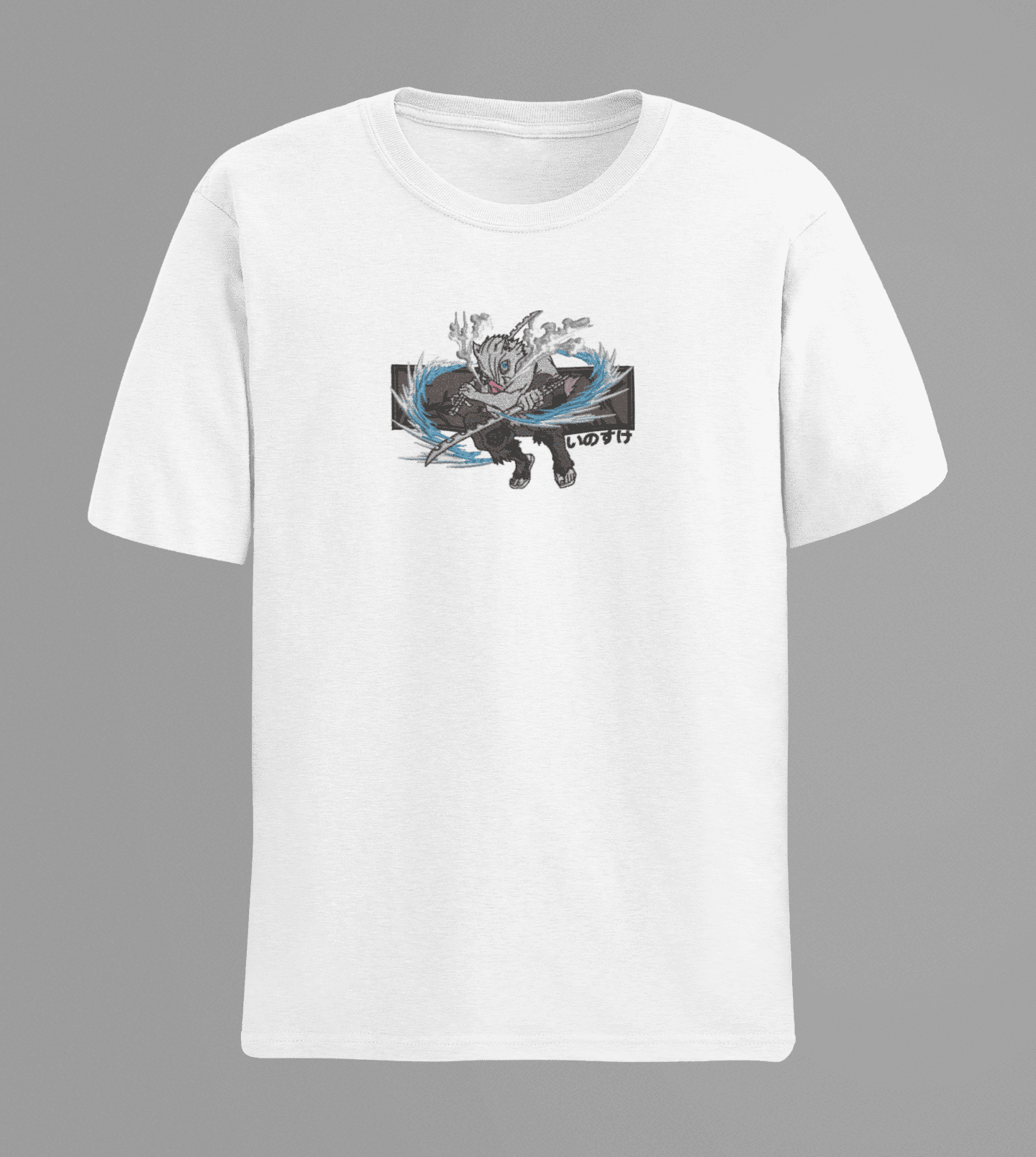 Premium embroidered Inosuke Hashibira anime T-shirt featuring detailed stitching, breathable fabric, and bold Demon Slayer streetwear style.