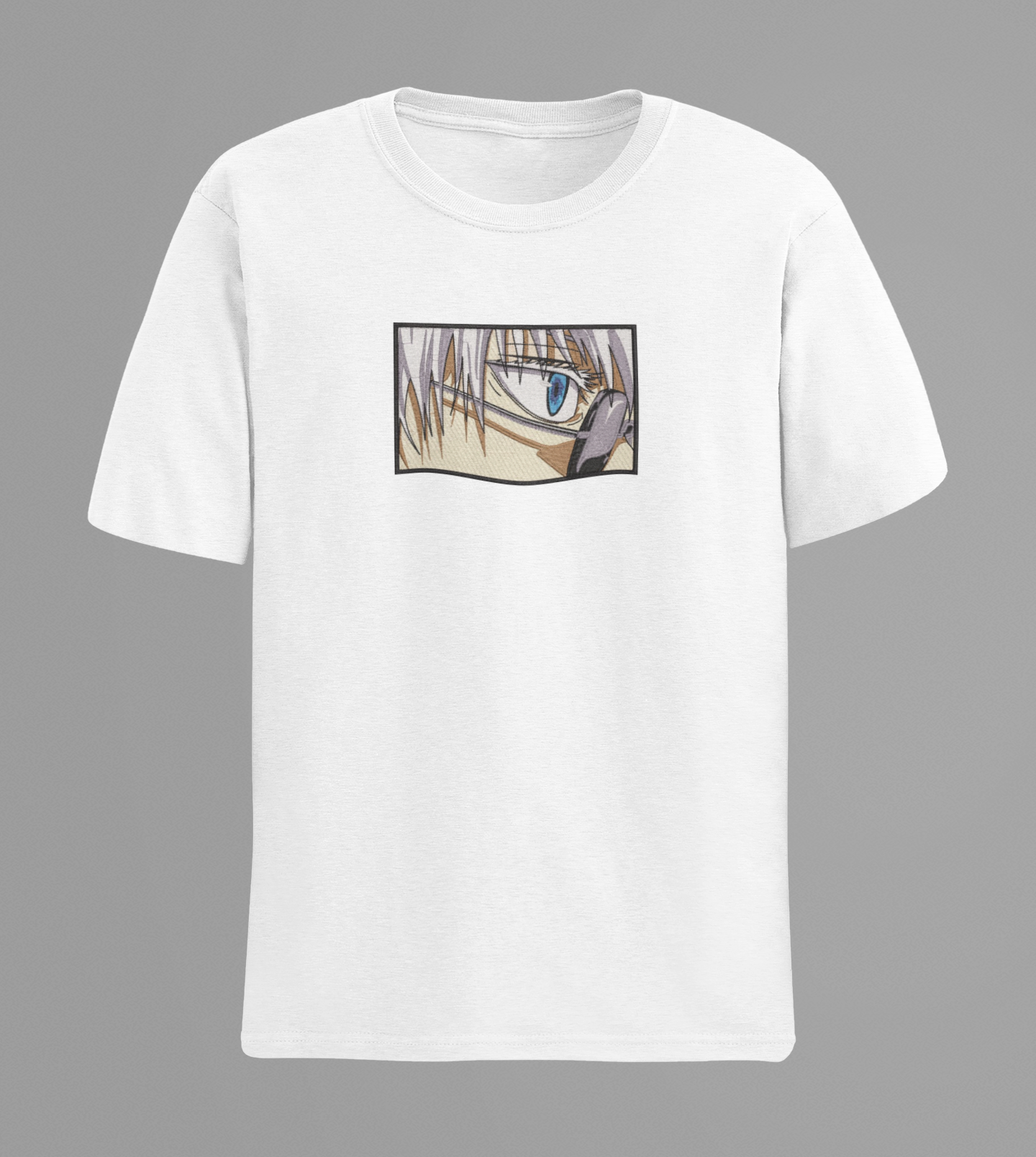 Premium Satoru Gojo embroidered t-shirt inspired by Jujutsu Kaisen, combining iconic anime style, comfort, and durability.