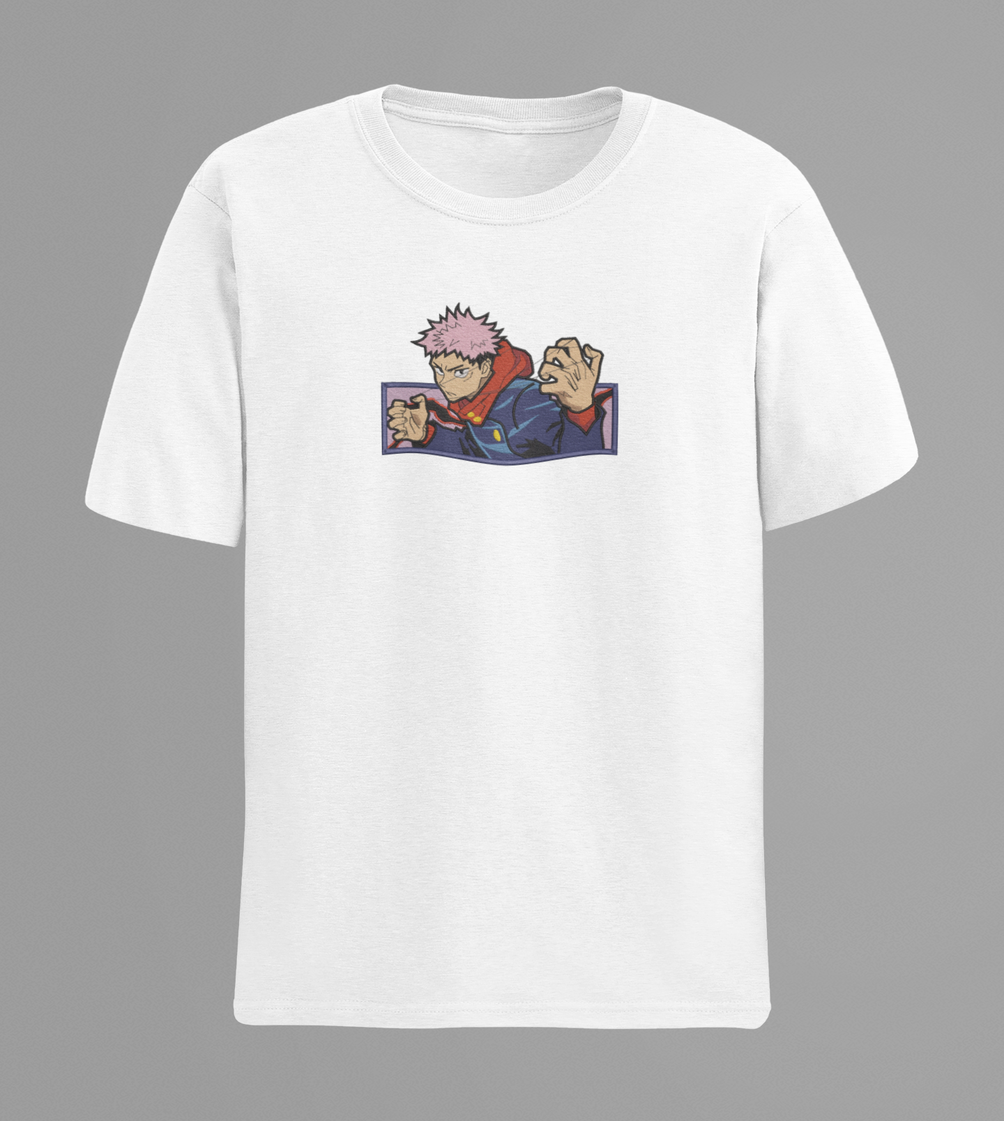 Yuji Itadori embroidered T-shirt featuring detailed stitching and premium cotton fabric for Jujutsu Kaisen anime fans.