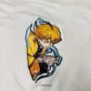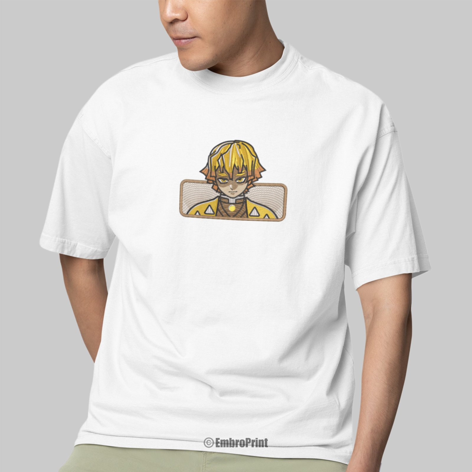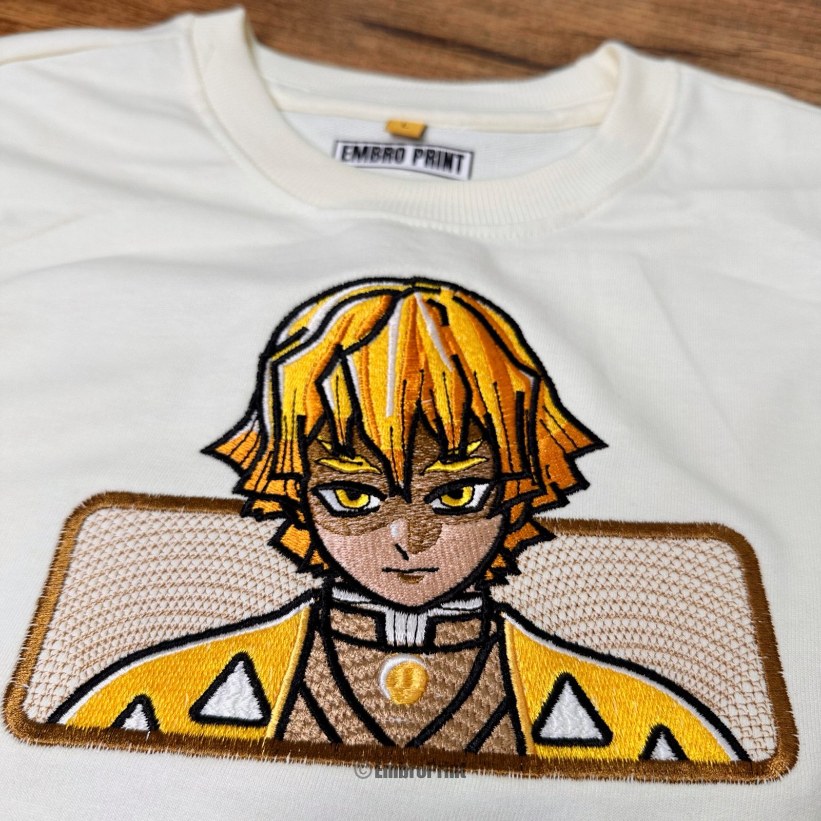 Oversized unisex 240 GSM cotton tee with embroidered Zenitsu Agatsuma design, front (4/6/8 inches) & bold 8-inch back, in 5 colors.