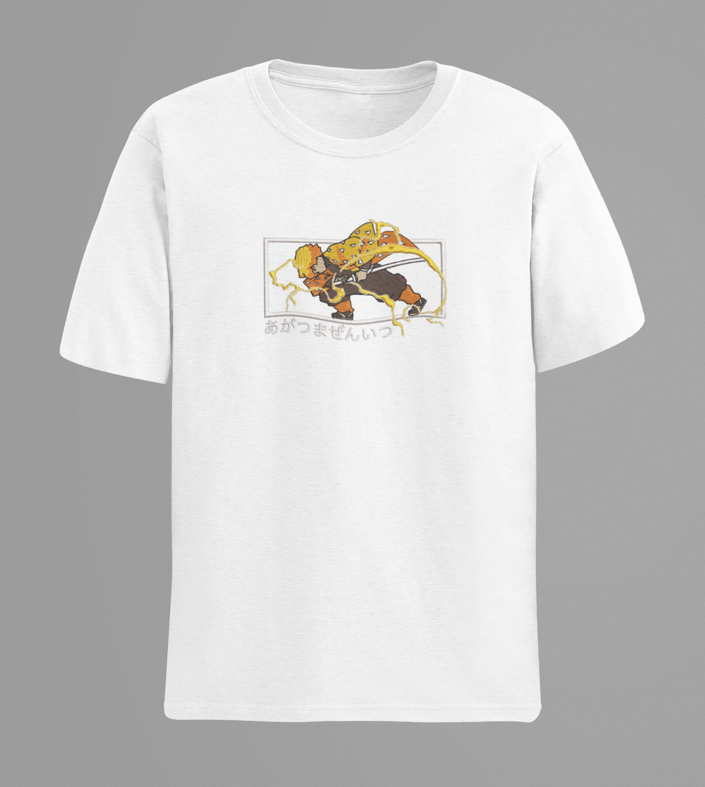 Premium Zenitsu Agatsuma embroidered T-shirt featuring detailed stitching and comfortable cotton fabric for Demon Slayer anime fans.